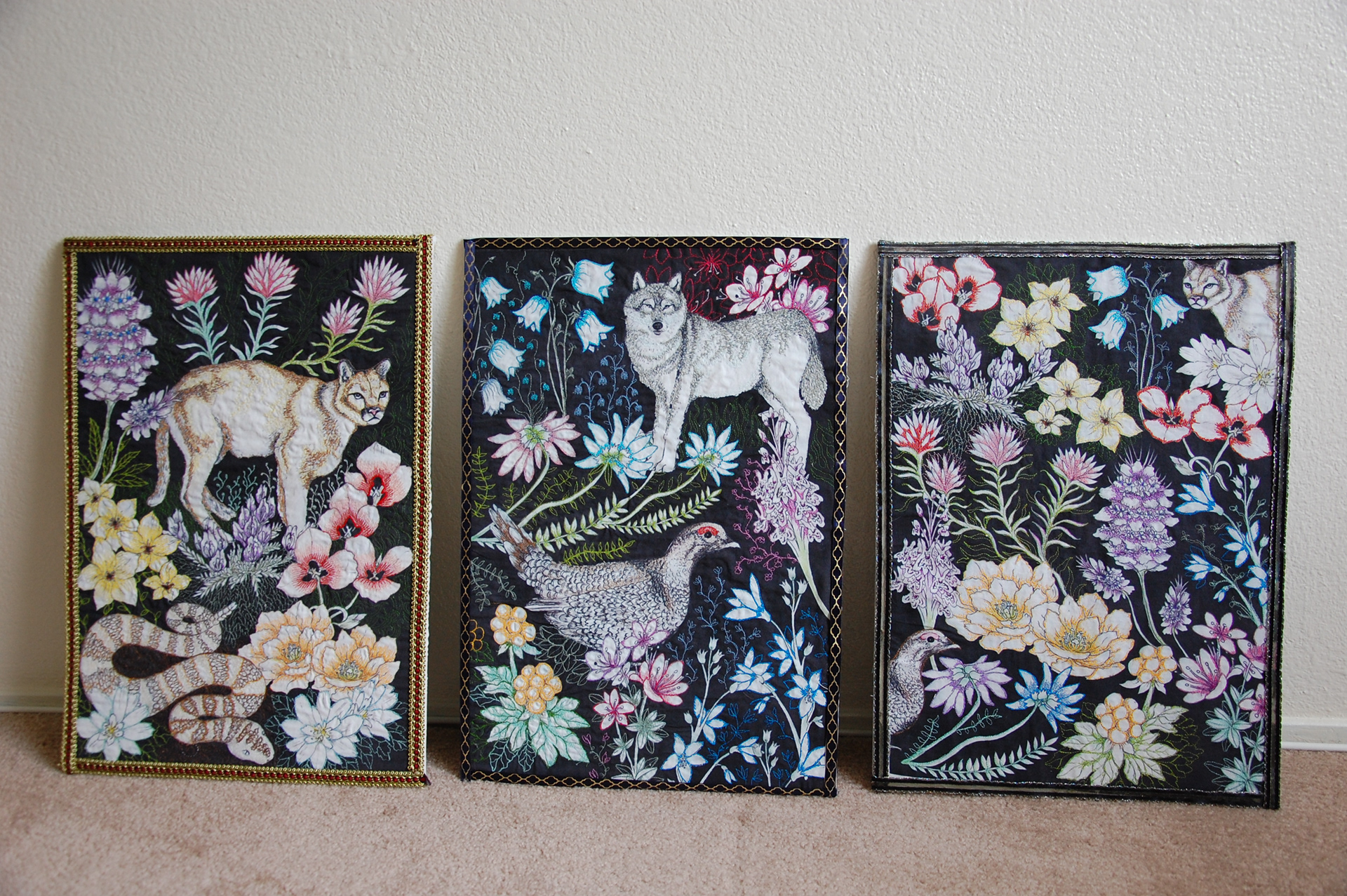 A textile art project that looks at the opposites of natural surroundings. I am a Finn living in California and I got inspired by the drastic difference in these two climates areas. This series of three wall-hangings "Californian Wild", "Arctic Howl" and "Climatic Fusion" compares the flora and fauna of Finland and California. It focuses on the Arctic Finnish nature in Lapland (the most northern region in Finland) and the desert climate areas such as Death Valley in California. When in subarctic climate the weather is fairly cold around the year with its specific plants that have adapted to it, in subtropical climate the animals and flowers have had to adjust to the heat and dryness of desert. The idea is to handle the theme with an experimental approach to textile and surface design, combining different techniques such as machine (and hand) embroidery and digital printing. Visually the depiction of the theme is combination of abstract and representational appearance. It stimulates visually and expresses the core feelings and impressions the theme awakens. The series of textile artworks is vibrant, colorful and detailed, and offer the sense of texture and atmosphere of arctic and subtropical nature. Designs are printed with Mimaki printer on cotton fabric and embroidered on top. "Californian Wild" was a part of the "Persistence" exhibition at the Museum of Northern California Art during summer 2018.