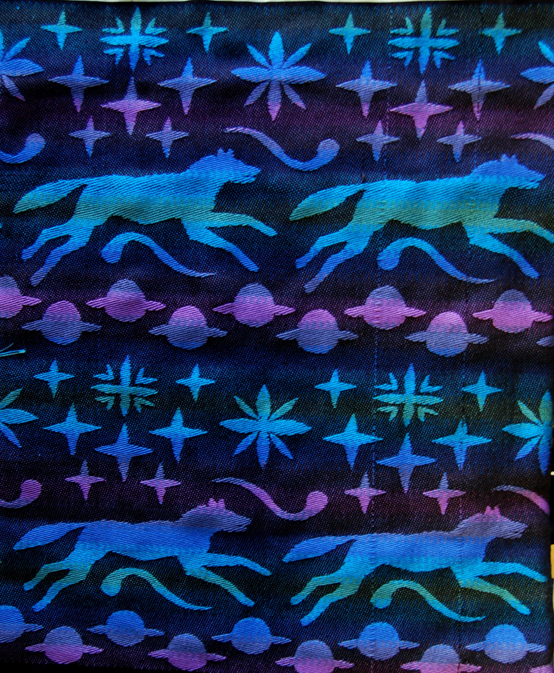 Customer oriented project where the customer wanted a textile design with mystical, space and nature themed pattern and bright, bold colors in harmony with each other. Inspired by fairytales and based on the imaginative fusion between cosmic elements and the natural world, the wolf as a spirit wanderer in the sky. Woven fabric is created with jacquard technique and printed textile is created by block/stencil printing. Digital print created with hand-drawing and Photoshop and presented in the online shop Society6.