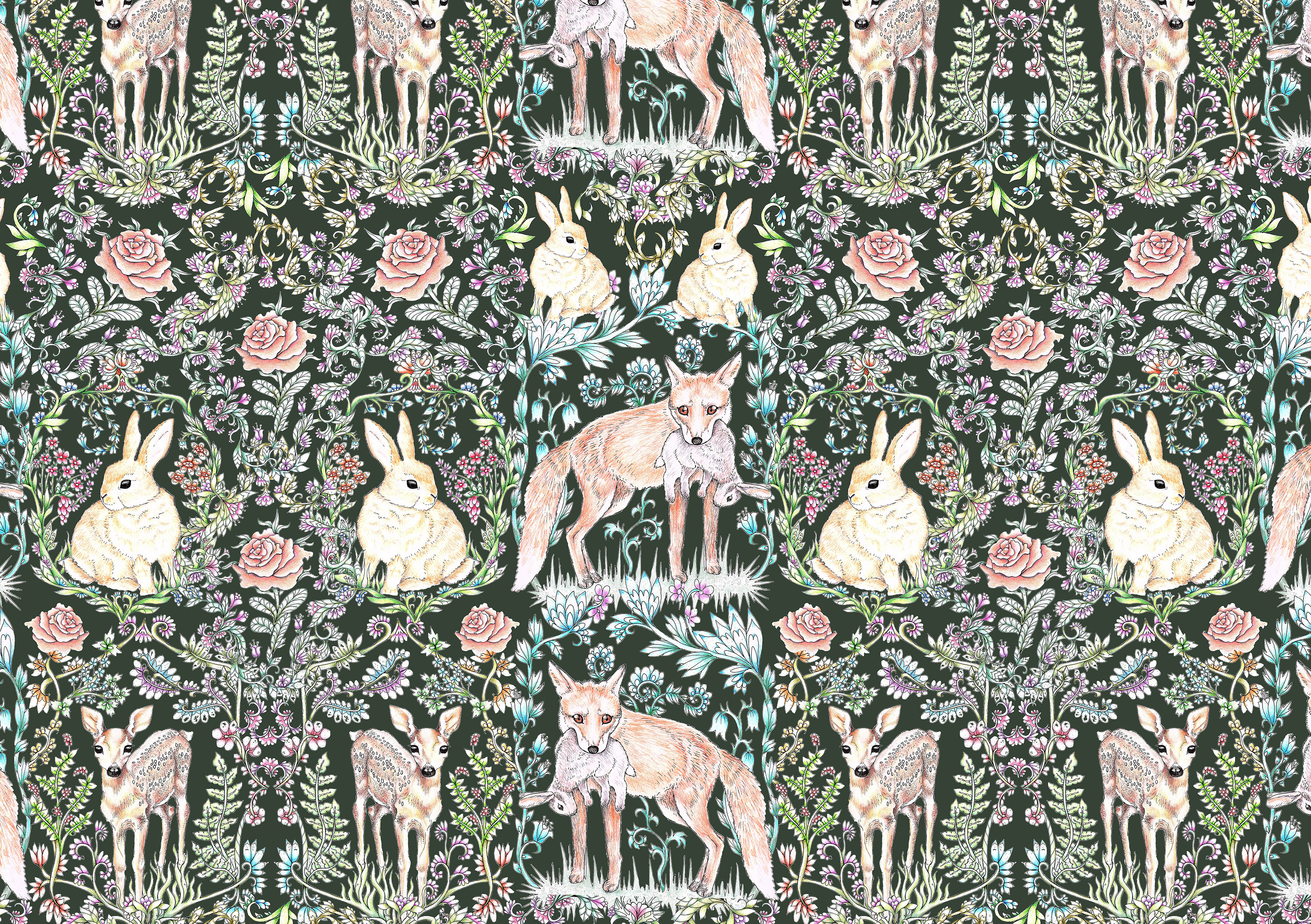 Textile pattern design inspired by Rococo style with its organically flowing forms and the abundance of details. Playing with typically endearing elements in contrast to the brutal nature of life.